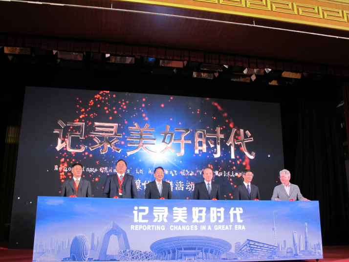 中宣部副部长蒋建国(左三),新华社总编辑何平(右三),全国政协文化文史和学习委员会副主任叶小文(左二),新华社副社长刘正荣(右二),中央网信办移动网络管理局局长方楠(左),柯文思导演共同启动“记录美好时代”融媒体传播活动 (摄影/胡帆)