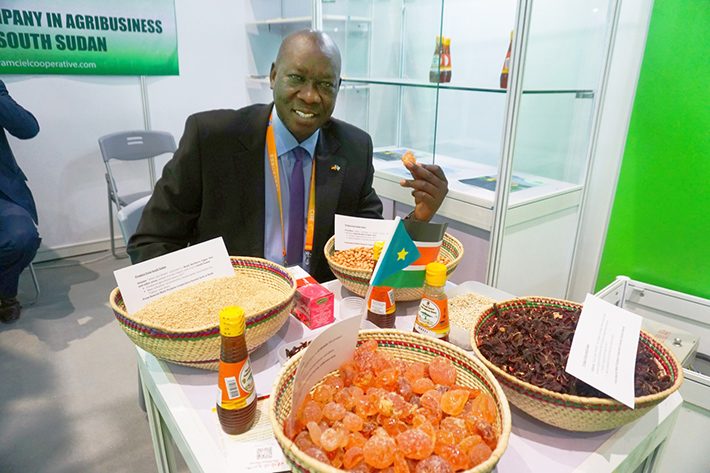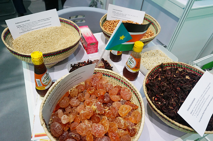 来自南苏丹的参展企业Ramciel Multi-Purpose Cooperative Society带来了南苏丹的芝麻、花生和阿拉伯树胶等产品。企业顾问Kuyu Dhel告诉记者,阿拉伯树胶是一种树的渗出物,基本不产生热量,可以被用于保健品糖果及碳酸。也可以广泛用于工业。南苏丹是非洲阿拉伯树胶的最大产地。