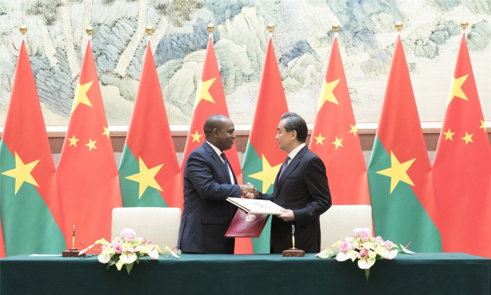 5月26日,国务委员兼外交部长王毅在北京同布基纳法索外长巴里签署《中华人民共和国与布基纳法索关于恢复外交关系的联合公报》。(新华社)