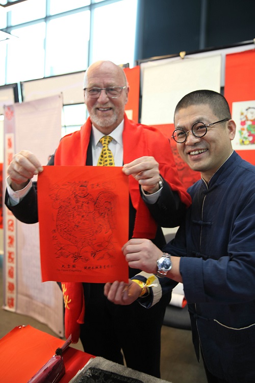 南非旅游部长哈内科姆展示他跟随开封木板年画传人任涛学习印制的木版画《门神》。(中国与非洲记者李建国 摄)