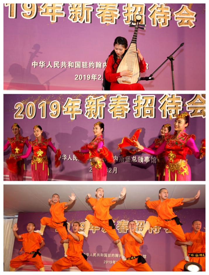 四海同春艺术团在招待会上表演了精彩的节目。此次四海同春艺术团一行于2月7日至23日期间访问阿联酋、南非、肯尼亚3国,分别在迪拜、内罗毕、开普敦和约翰内斯堡4个城市演出5场。艺术团由河南演艺集团和少林武僧团担纲,并邀请阎维文、蔡国庆、龚爽、徐晶晶、赵越等国内知名声乐艺术家参团。