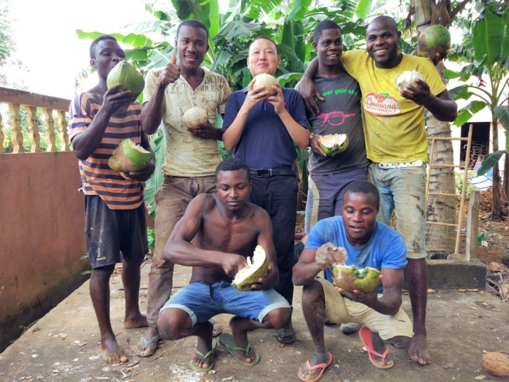 黄健和沼气池建设者一起分享椰子果。(黄健提供)