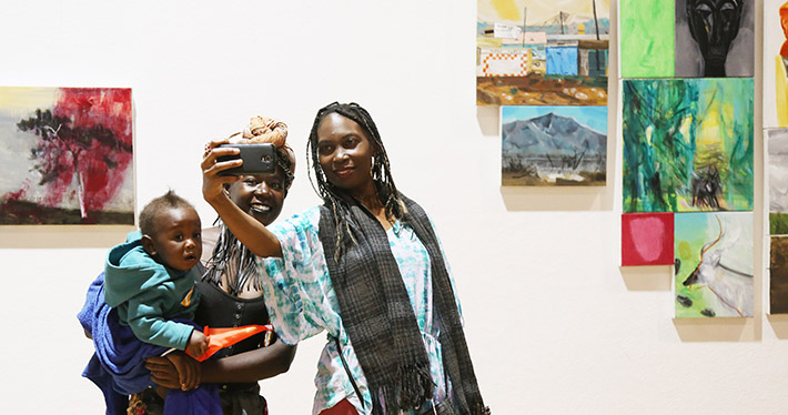 津巴布韦首都哈拉雷的国家艺术馆,观众与艺术作品自拍合影。(新华网)