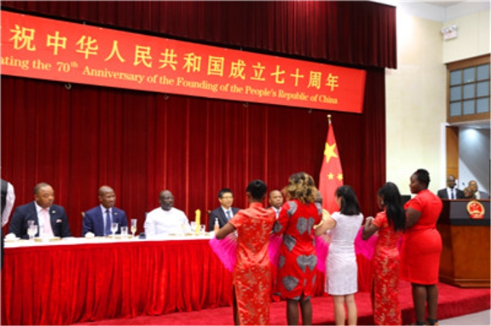 9月19日,驻利比里亚使馆举行国庆招待会,隆重庆祝中华人民共和国成立70周年。利总统维阿、众议长钱伯斯、临时参议长阿尔伯特·切、外交部长代理部长范布雷、国务部长麦吉尔、财政部长特韦等多位利政府内阁成员、议员、各界人士,各国驻利使节、国际组织代表等近300人出席。