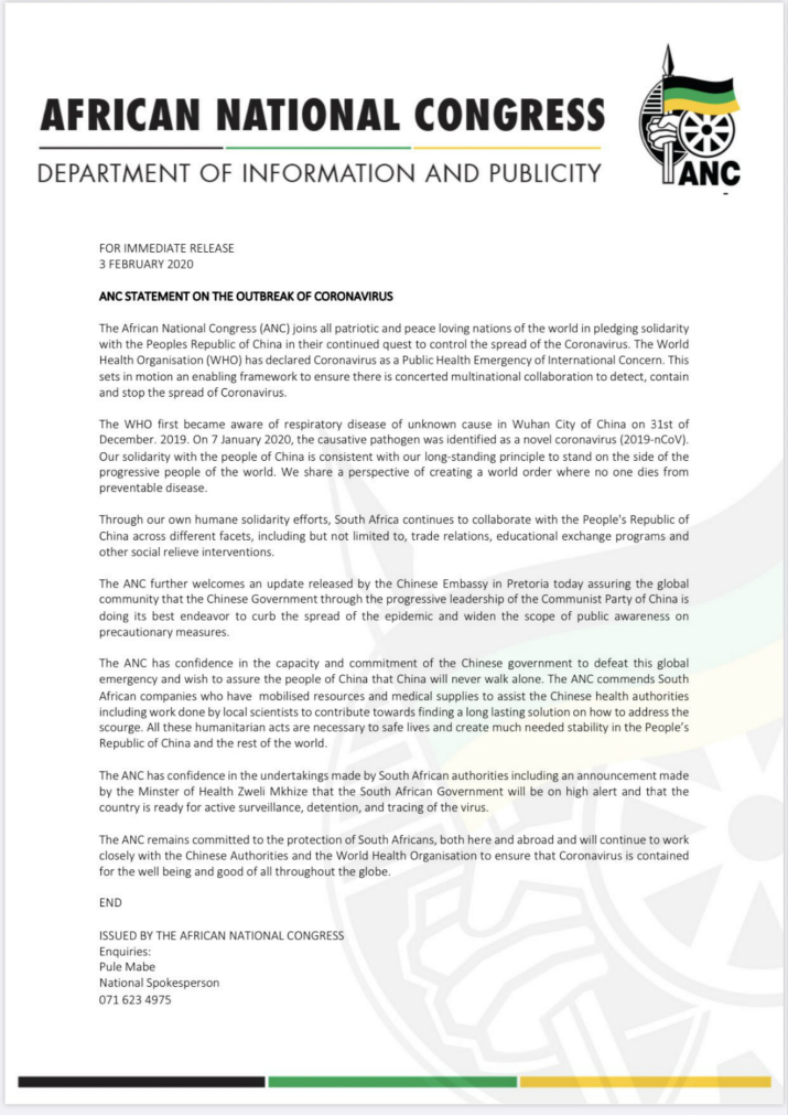 2月3日,南非执政党非洲人国民大会(非国大)发表声明,支持中国抗击新型冠状病毒感染肺炎疫情努力,赞赏中方抗疫担当,对中方抗疫能力充满信心,将始终与中国站在一起。声明主要内容翻译如下: