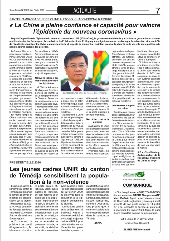 2020年2月4日,中国驻多哥大使巢卫东在多哥官方报纸《多哥新闻报》发表署名文章《中国完全有信心、有能力战胜新型冠状病毒肺炎疫情》。编者在文章最开始醒目位置强调:“中国驻多哥大使让多哥民众放心”。文章主要内容如下: