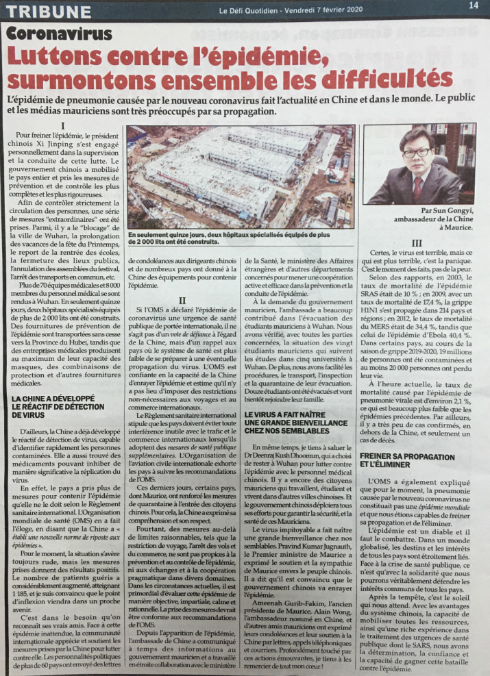 2020年2月7日,驻毛里求斯大使孙功谊在毛主流媒体《挑战报》发表题为《抗击疫情,共克时艰》的署名文章,阐明中国政府为抗击肺炎疫情所作努力,请毛民众客观看待疫情,切勿制造不必要的恐慌。全文如下: