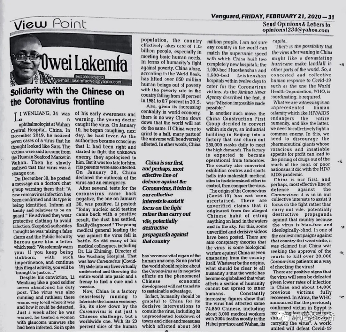 2月21日,尼日利亚学者拉克姆法在《先锋报》发表题为《在抗疫前线上与中国同行》的评论文章,指出中国处于抗击新冠肺炎疫情的最前沿,同时也是最坚固的一条防线,抗击疫情决不能让中国孤军作战,团结协作而非造谣污蔑才符合世界人民的共同利益。