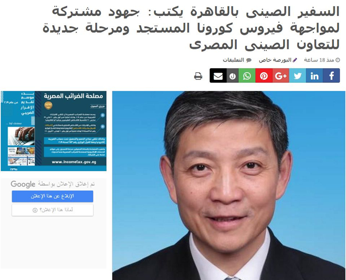 近日,埃及《股市报》发表驻埃及大使廖力强文章《直面疫情考验,中埃合作历久弥坚》,全文如下: