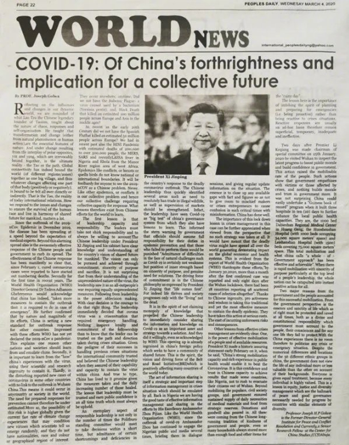 3月4日、5日,尼日利亚和平与冲突解决研究所前所长约瑟夫·戈尔瓦教授在尼主流媒体《人民报》、《蓝图报》、《太阳报》等发表题为《中国抗疫行动坦诚正直,对人类共同未来富有启示》的评论文章,高度评价中国为防控新冠肺炎疫情所作努力和牺牲,赞赏中方用实际行动带头践行了构建人类命运共同体思想和共建“一带一路”倡议,呼吁各国学习中国经验,共同抗击疫情。