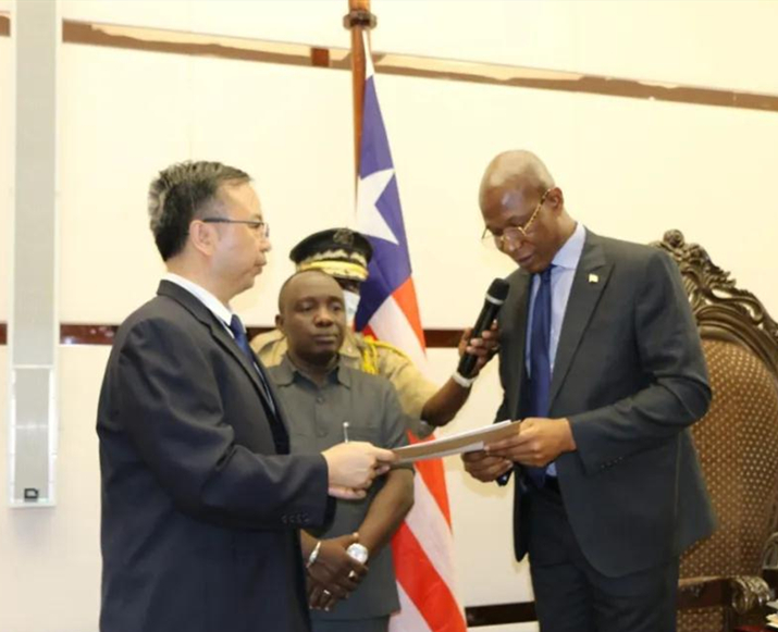 利比里亚众议长钱伯斯(右)向中国驻利比里亚使馆临时代办胥琨(左)转达议会决议。(郭骏 摄)