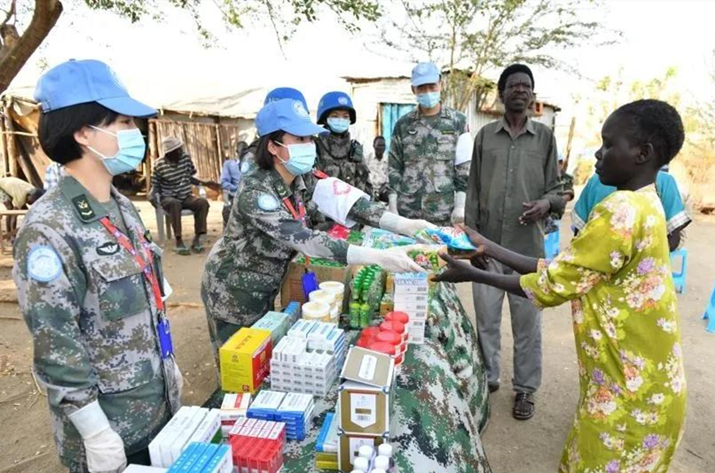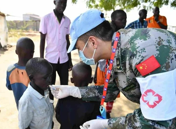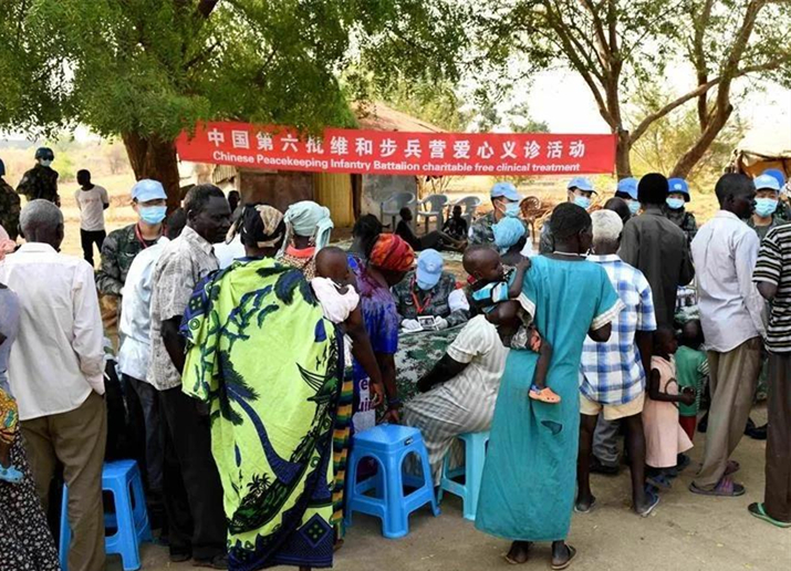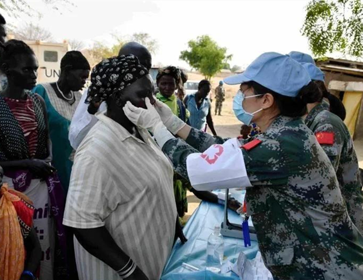 近日,中国第六批赴南苏丹(朱巴)维和步兵营官兵走进联合国营区附近的皇后村,为民众进行义诊活动,受到当地村民的赞扬。