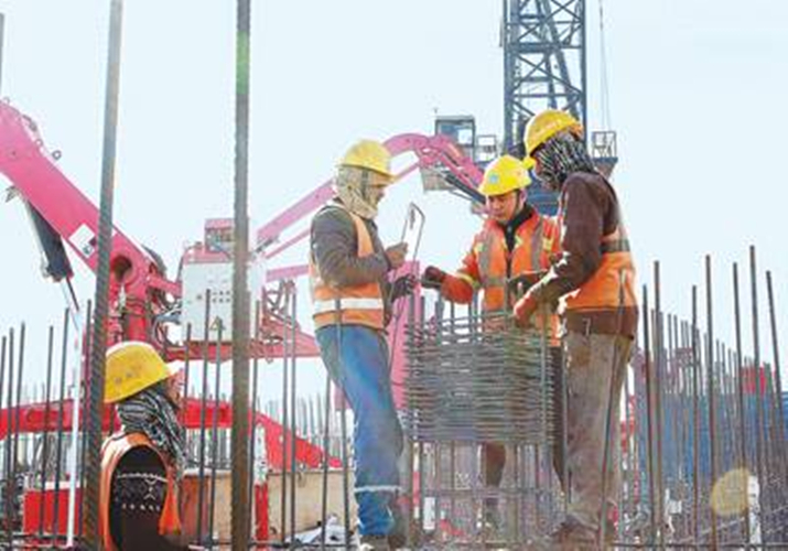 埃及新首都中央商务区“标志塔”工程施工现场,中埃两国项目员工共同绑扎钢筋。(中国建筑埃及分公司供图)