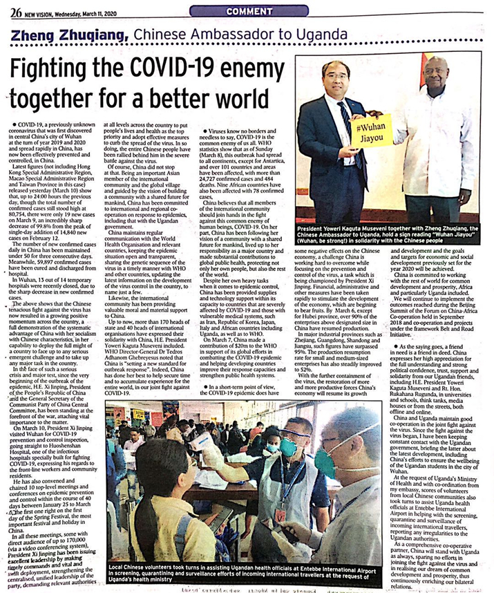 3月11日,乌干达第一大报《新愿景报》以一个整版全文刊登驻乌干达大使郑竹强署名文章《共战新冠疫情公敌,共创更加美好世界》,并在该报头版醒目位置配发导读指引“中国正在夺取抗击疫情胜利”。
