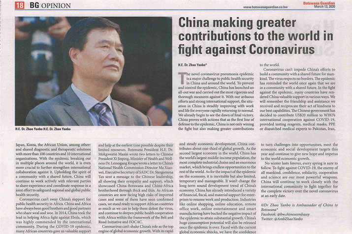 近日,驻博茨瓦纳大使赵彦博在当地主流媒体《博茨瓦纳卫报》发表题为《中国在抗疫斗争中为世界作出更大贡献》的署名文章,全文如下: