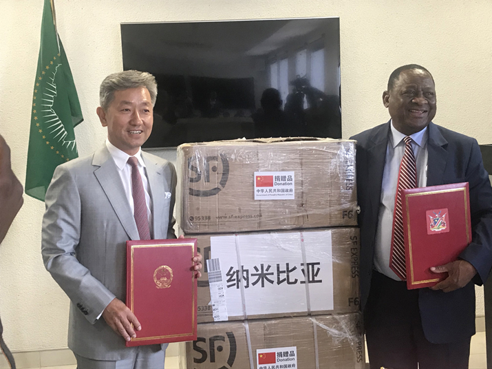 3月18日,中国驻纳米比亚大使馆向纳米比亚卫生部捐赠新冠肺炎病毒检测试剂盒,张益明大使出席并发表讲话。纳卫生部部长卡隆比·尚谷拉、执行长本·南贡贝,世卫组织驻纳代表查尔斯,中国援纳医疗队队长及纳各大媒体参加。