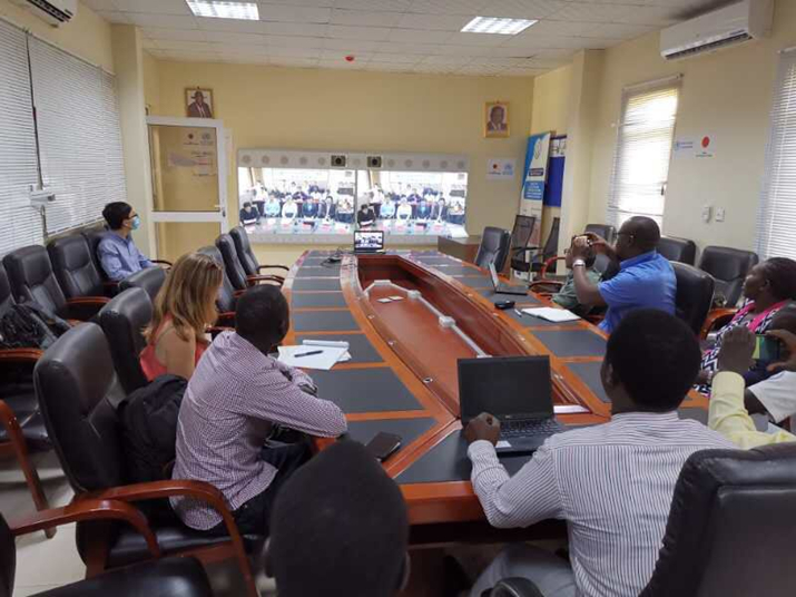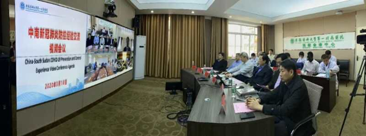 3月18日,中国驻南苏丹使馆多功能厅、安徽医科大学第一附属医院互联网医院、中国(安徽)援南医疗队驻地、南苏丹卫生部应急指挥中心四地连线,华宁大使和安徽省卫健委、省疾控中心、安医大一附院、援南医疗队及南卫生部、世卫组织驻南代表处负责人和专家共同出席中南新冠肺炎疫情防控工作视频会议。