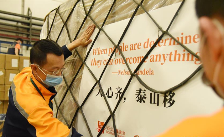 “When people are determined they can overcome anything”——运抵非洲的“抗疫”物资上贴着南非已故前总统曼德拉的名言,并翻译成中文谚语“人心齐,泰山移”。据悉,这批物资包括540万只口罩、108万套试剂盒、4万套防护服和6万个防护面罩,将平均分配给54个非洲国家。埃塞俄比亚总理阿比将与联合国世界粮食计划署、非洲疾病预防控制中心合作,负责物资在非洲的物流和分发工作。