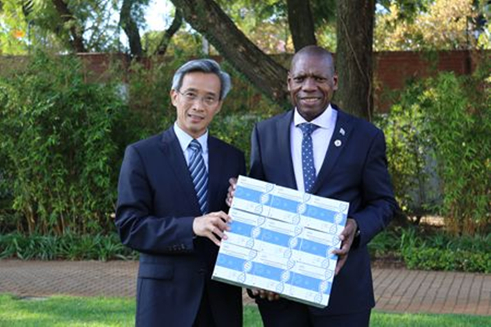 林松添大使和穆凯兹部长交接新冠肺炎病毒试剂(中国驻南非使馆提供)