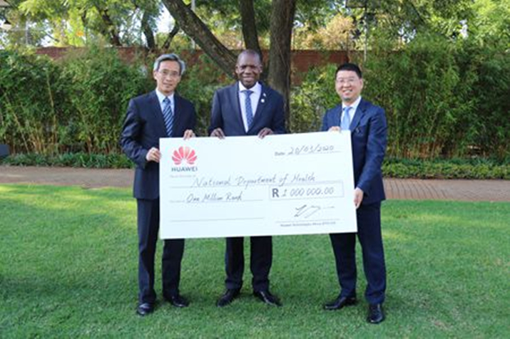 林松添大使(左)和华为南非公司总经理范文(右)向南非卫生部长穆凯兹转交捐款支票(中国驻南非使馆提供)