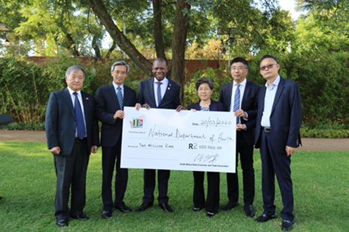 3月20日,中国驻南非大使馆举行捐款交接仪式,在南中资企业和华侨华人向南非政府转交300万兰特善款和新冠病毒检测试剂盒,坚定支持南方抗击新冠肺炎疫情。中国驻南非大使林松添,南非执政党非国大总书记马哈舒勒、卫生部长穆凯兹,南中经贸协会会长汪文安、华为南非公司总经理范文、南非华人警民中心主任李新铸、全非洲和平统一促进会会长徐长斌等出席仪式。中国驻南非使馆有关部门负责人、中资机构和华侨华人代表等参加。
