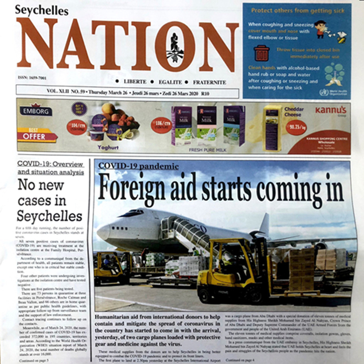 塞副总统梅里顿在物资到达的第一时间致电中国驻塞舌尔大使郭玮表示感谢。当日塞外交部网站及脸书(Facebook)发布接受该批援助物资消息,称塞政府向马云、马云公益基金会和阿里巴巴公益基金会表示感谢。25日至26日,塞舌尔广播电视台(SBC)、塞第一大报《民族报》、第二大报《今日报》均对该批物资运抵塞舌尔进行了详细报道。