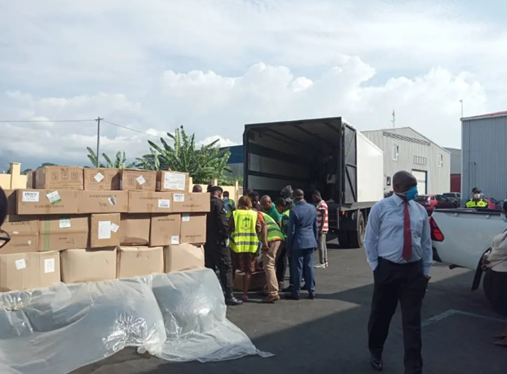 3月26日下午,马云公益基金会和阿里巴巴公益基金会向赤道几内亚捐赠的医疗物资从埃塞俄比亚亚的斯亚贝巴运抵马拉博。这批物资包括10万只口罩、2万套试剂盒、1000套防护服和1000个防护面罩。赤几卫生与社会福利国务部长恩圭马、民航部长米科代表赤几政府在马拉博国际机场接收。恩圭马对中国民间力量的捐赠表示感谢,认为这批物资对赤几疫情防控十分重要。