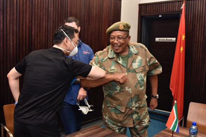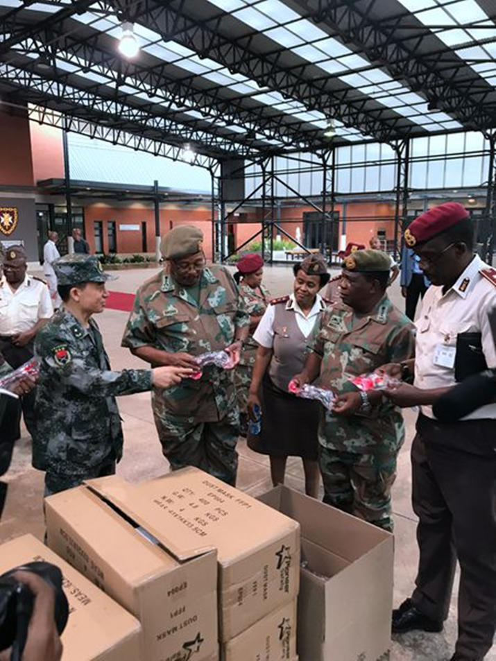 3月26日,南非国防军在比勒陀利亚举行仪式接收来自中国企业海诺克斯公司(Hennox Supplies)捐赠的医疗物资。根据总统拉马福萨的命令,南非国防军将于27日全面参与执行“全国封禁”任务。此次启动大规模非战争军事行动令南军对个人医疗防护装备需求大幅提升,战略储备吃紧。为支持南军抗疫努力、缓解其紧急需求,中国驻南非使馆积极协调海诺克斯公司向南军捐助3万个口罩、2000个护目镜。南国防军司令肖基上将、参谋长亚姆中将、后勤部长姆布里中将、军事卫生部队副司令恩赫德洛乌少将、中国驻南非使馆武官尚鸿少将、海诺克斯公司董事长顾晓晔等出席捐赠仪式。