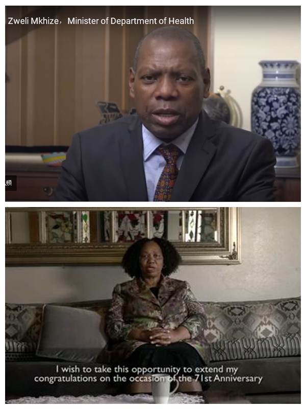 卫生部长穆凯兹、基础教育部长莫采卡等南政府高层及各界嘉宾在祝福视频中,纷纷热烈祝贺新中国成立71周年,盛赞中国共产党带领中国人民取得举世瞩目的发展成就,祝贺中国克服疫情影响率先实现经济发展,感谢中国对南对非慷慨抗疫援助,认为这再次体现了中国是南非和非洲最重要、最可靠的合作伙伴。面对复杂国际环境和严峻疫情挑战,南中双方应加强团结合作,不断深化友谊,坚持多边主义,促进国际社会合作共赢、共同发展。在南中资企业机构、华侨华人、留学生等纷纷祝福祖国生日快乐、越来越好!