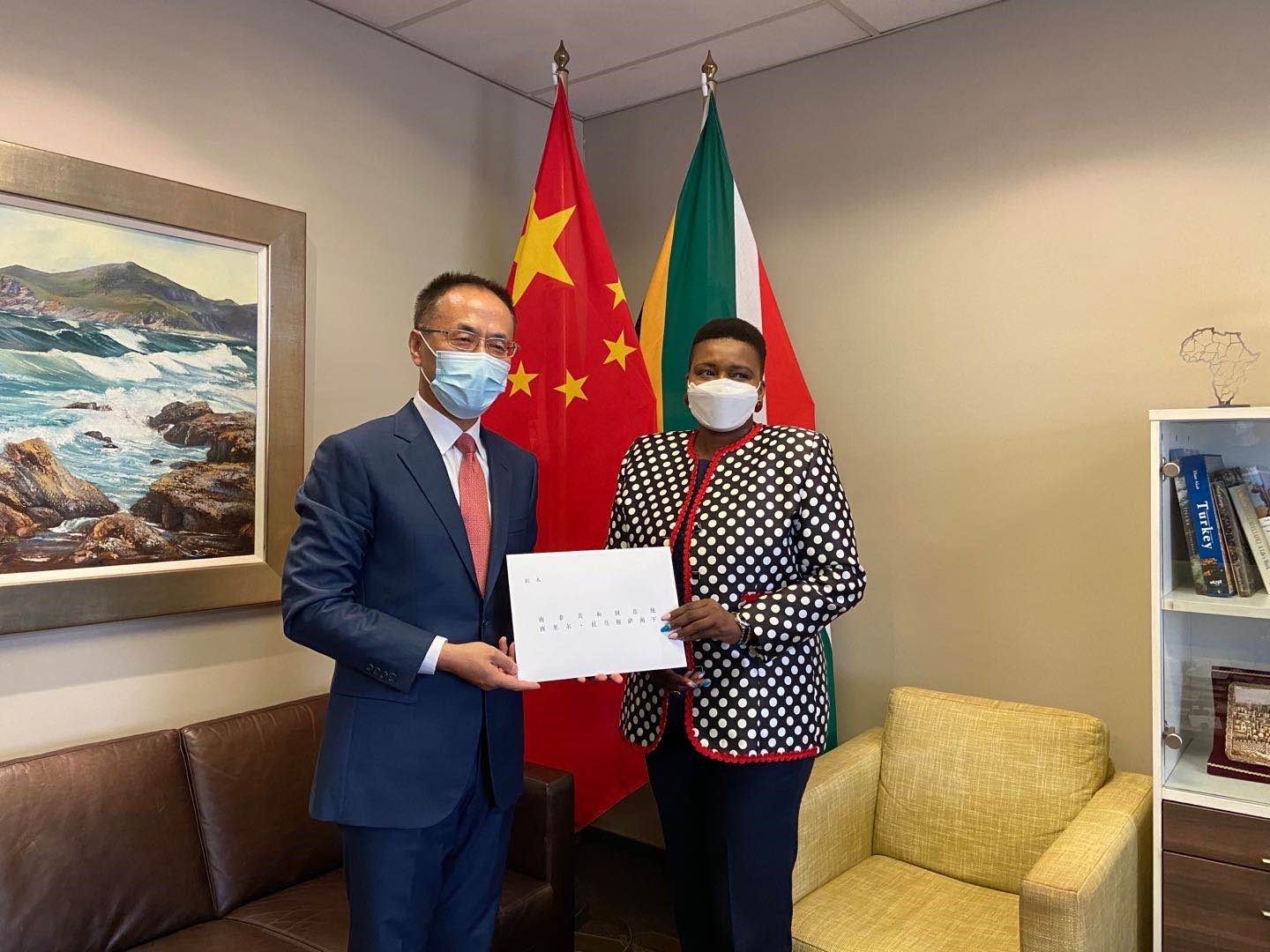 10月8日,新任中国驻南非大使陈晓东向南非国家典礼局局长、外交部主管礼宾事务的副总司长露茜大使递交国书副本。