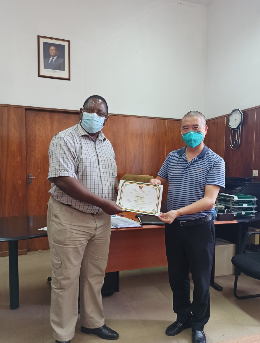 2021年10月7日,莫桑比克农科院院长为专家组的每位成员颁发了表彰证书,表彰他们为当地农业发展作出的突出贡献,并赠予他们莫桑比克特色礼物卡普拉纳斯。次日,胡小全还收到了莫桑比克马普托动物科学中心负责人向他们颁发的莫桑比克国际农业科学技术合作奖证书。