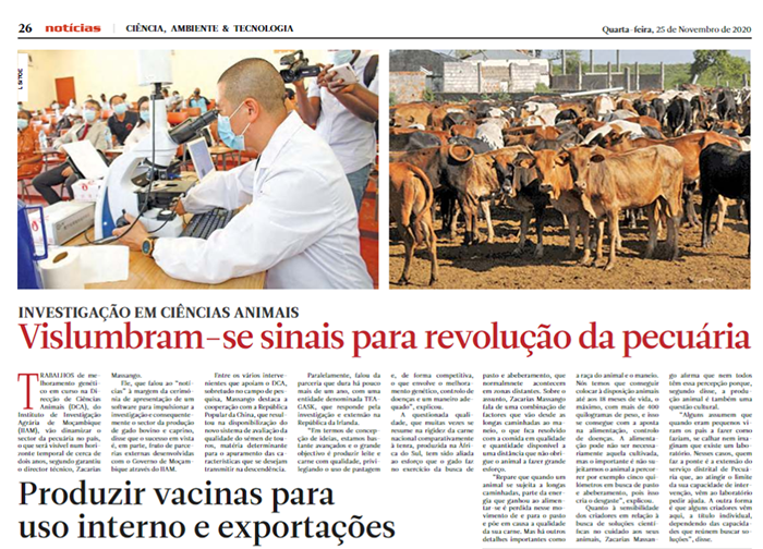 此后,莫桑比克官方媒体、最具影响力的《消息报》发表了一篇题为《动物科学研究:牲畜革命的迹象可见》的技术性文章,对胡小全研发的动物精子检测分析系统和交接仪式进行了详细报道,并表明该系统的实践应用是对莫桑比克畜牧业发展的一次历史性变革。