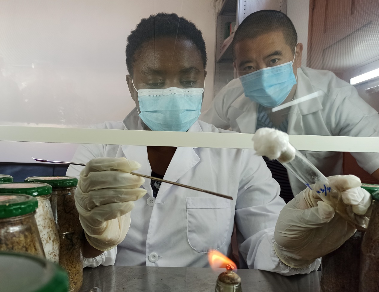 2021年5月20日,胡小全在莫桑比克马普托动物科学中心食用菌研究实验室指导学员采用超净工作台接种食用菌菌种。(胡小全提供)