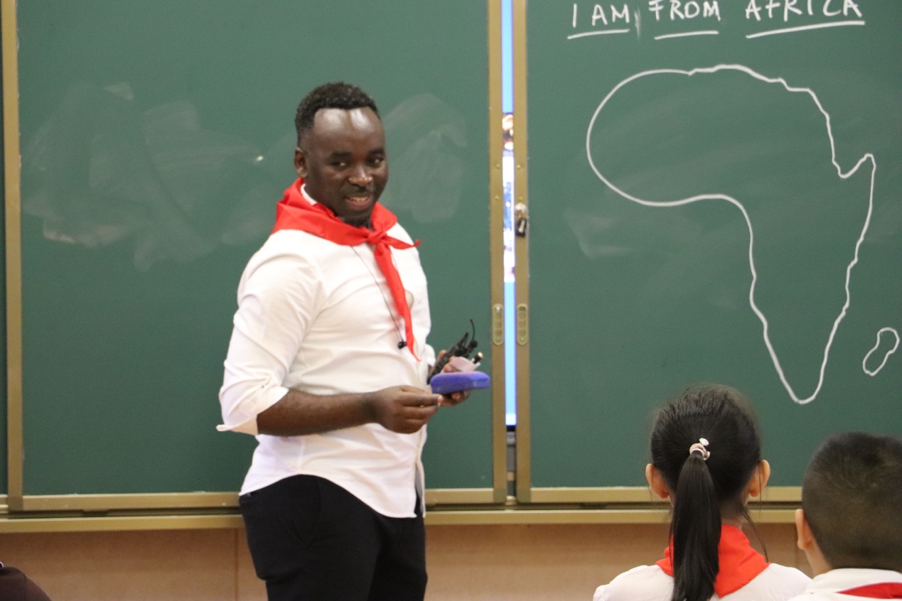 在五楼的录播室里,卢旺达留学生天赐带来了一堂关于非洲的英语课。学生们跟随着他重复着“Africa”这个对于友谊小学来说具有特殊意义的单词。