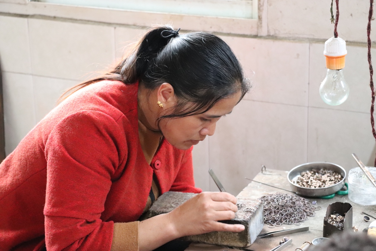 接下来爱非客一行来到了位于金河镇干塘村委会水碓冲村体验那里的银饰打造文化。据该村监督委员赵美芬介绍,瑶族银饰打造文化传统可以上溯到清代,距今已有200多年的历史。银饰在瑶族人民的文化生活中扮演着重要角色。每位瑶族小伙儿若想要讨媳妇,必须准备一套银饰作为聘礼,根据当年银的价格高低,一套银饰可以卖到1万多到2万多之间。在瑶族的文化传统中,银饰是结婚不可缺少的一部分,即便赊账也要购买一套,不可以租用。这也成为了如今瑶族银饰的主要需求所在。由于水碓冲村很早就开始有银饰打造的传统,目前全村共有20多户家庭加工坊,占据了金平县95%的银饰市场。银饰打造给了村民在家门口就业的机会。打造一套银饰正常需一周时间,每套的净利润可达3000到4000元,对于一个家庭加工坊来说,每月的净收益可达1万多元。对于缺乏技艺的贫困户,当地政府组织外出培训,使其方便参与到银饰打造当中,取得稳定收入。瑶族银饰打造文化已成为该村脱贫致富的一条门路。