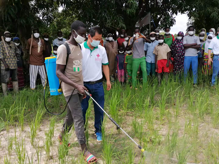 2021年8月9日,薛友国在Nariou示范村开展水稻病虫害机械防控试验示范,指导学员实际操作。(薛友国提供)