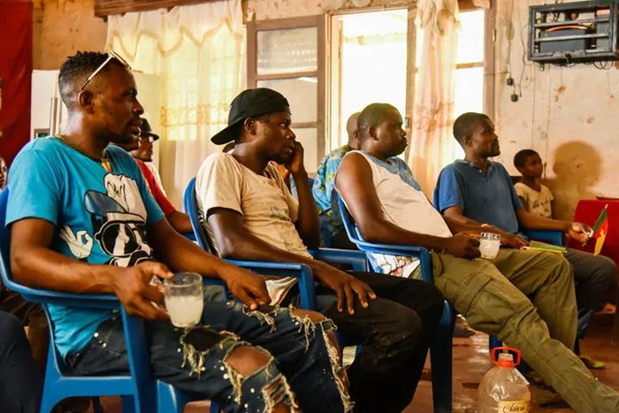 记者在采访时,适逢喀麦隆队的一场关键比赛。下午五点,恩东戈和约20名村民干完农活,提着一桶棕榈酒,来到村里的投影电视前观赛。