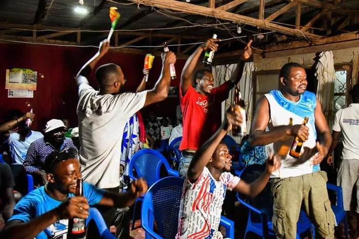 1月13日,喀麦隆中部大区第汝那村,村民饮用棕榈酒,通过投影电视观看非洲杯。新华社发(科普索摄)