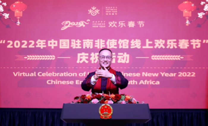 2022年1月28日,中国驻南非使馆隆重举行“欢乐春节”线上庆祝活动,中南各界朋友齐聚“云端”,共庆中国农历壬寅虎年春节,喜迎北京冬奥盛会。驻南非大使陈晓东出席并致辞,南非总统拉马福萨首次以视频方式向在南非及全球华人拜年并致辞,南非体育、艺术和文化部长姆特特瓦发表视频致辞,南非政府、政党、军队、工商、智库学者、新闻媒体等各界代表,以及在南中资机构、华侨华人、留学生等近千人应邀“云端与会”,超过15万中南民众同步收看活动直播。