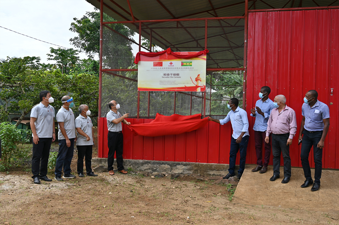 2021年11月10日,中国援圣多美和普林西比农牧业技术援助项目组在农科院揭牌启用中国援建的粮食干燥棚。(许州达提供)