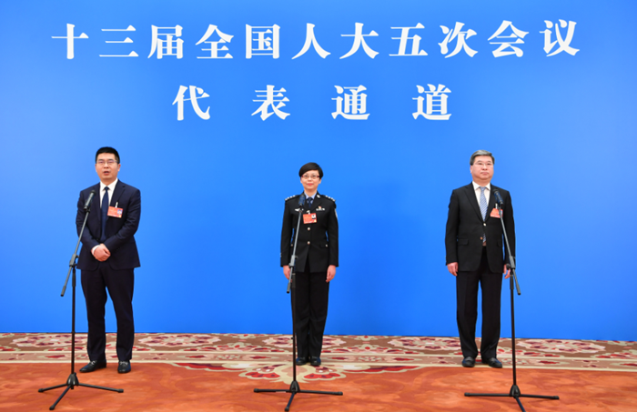 3月8日,第十三届全国人民代表大会第五次会议举行第二场“代表通道”采访活动,全国人大代表葛明华、杨蓉和陆文俊(从左至右)通过网络视频方式接受采访。(图片来源:新华)