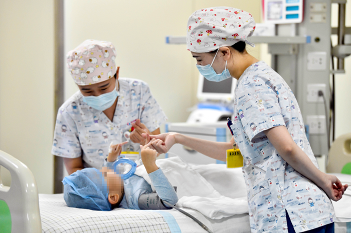 2022年1月1日,在山东省枣庄市妇幼保健院儿童ICU病房,医护人员为完成靶向治疗的4岁脊髓性肌萎缩症患儿加油鼓劲。(图片来源:新华)