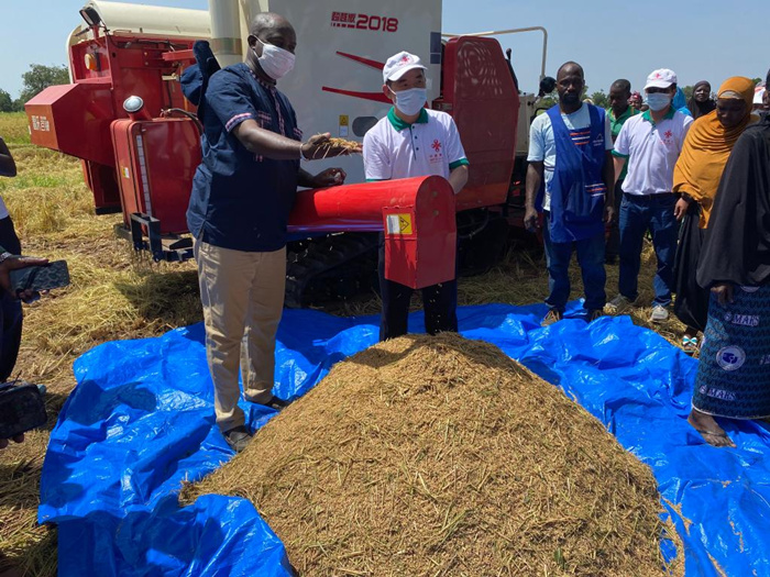 这是2021年10月8日,中国专家组成员在布基纳法索中西大区水稻示范区指导机械化水稻收割作业。(新华社发,中国农业组供图)