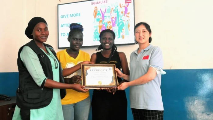 12月10日,在乌干达首都坎帕拉中乌友好医院,纳谷鲁青年健康互助社执行董事纳卡布比•谢里法(左一)为医疗队队长郭致平(右一)颁发募捐证书。中国第22批援乌干达医疗队 张辉摄