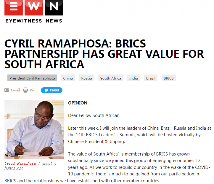 6月20日,目击者网站刊登南非总统拉马福萨署名文章《金砖伙伴关系对南非具有重要价值》,全文摘译如下:
