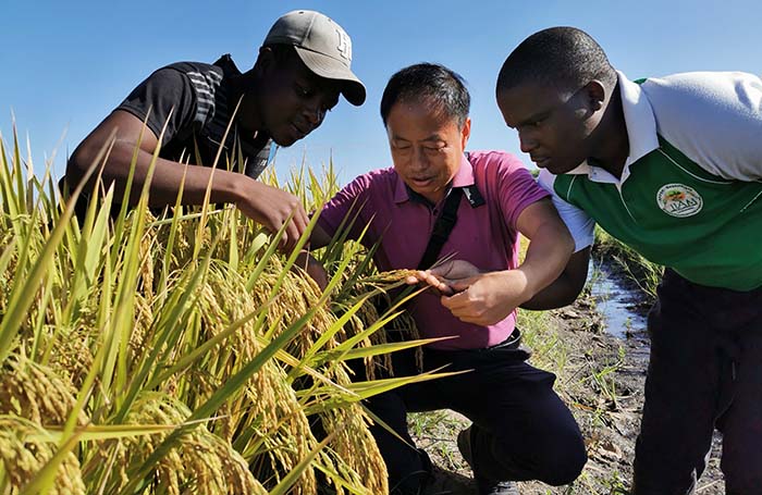 何昌永(中)向莫桑比克技术人员传授水稻种植技术。