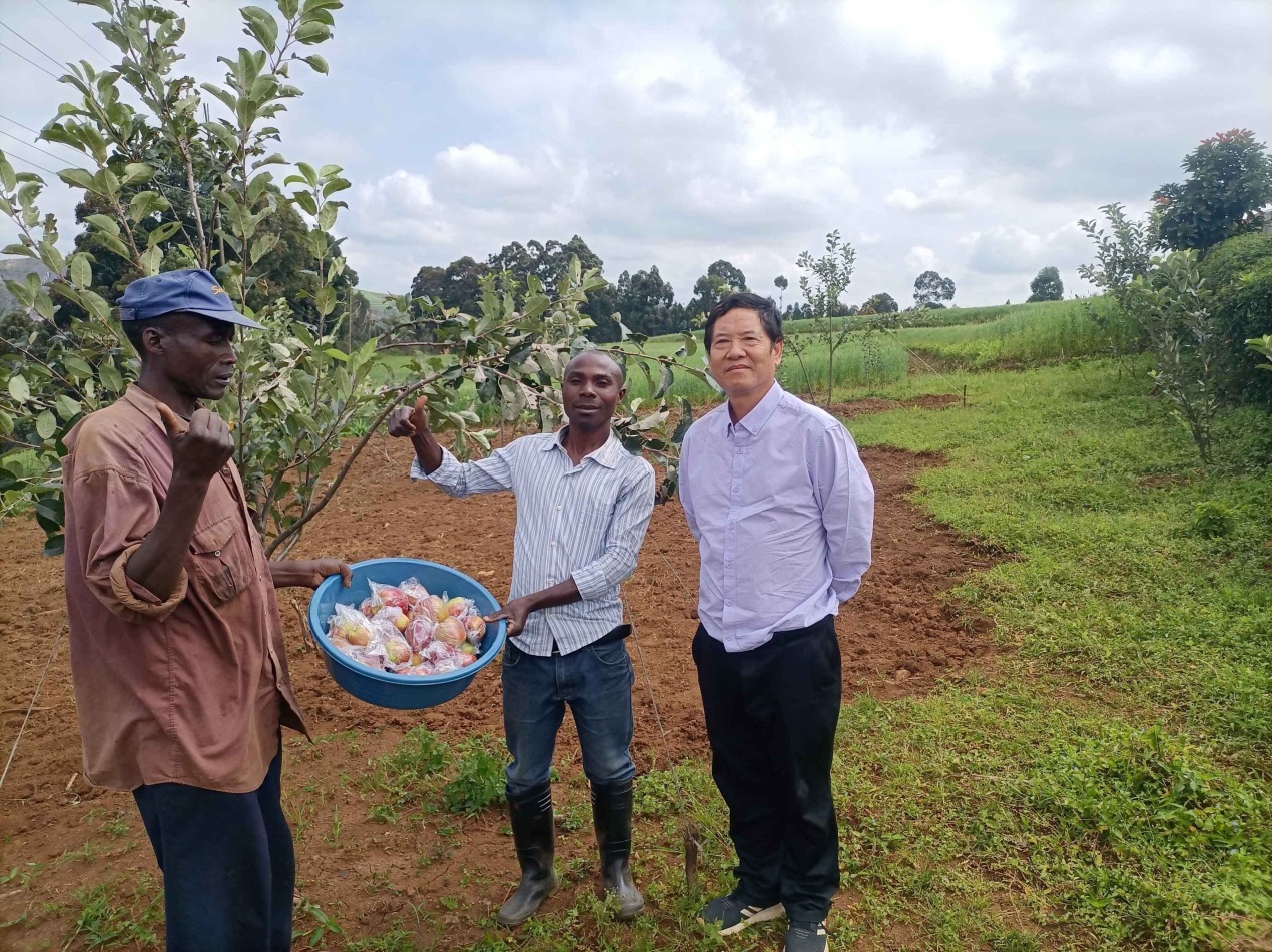 2021年5月25日,邓亮斌在布隆迪卡杨扎省指导的高原苹果引种试验成功试果。(邓亮斌提供)