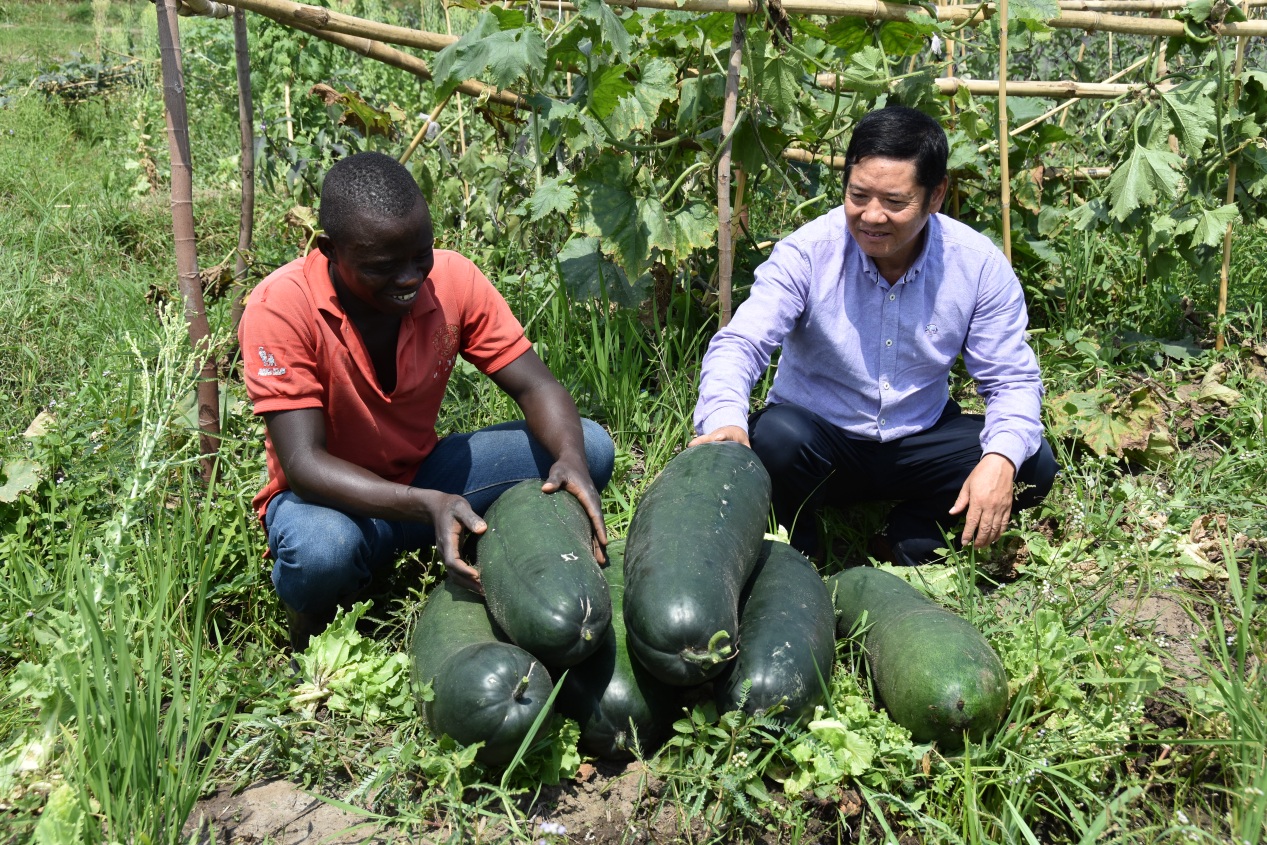 2018年9月10日,邓亮斌在布隆迪基杭加县林甲村指导的菜-稻轮作示范种植的黑皮冬瓜获得丰收。(邓亮斌提供)