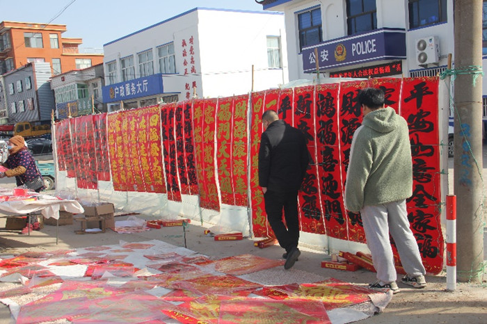 人们在大集上挑选春联。火红的春联是大集上一道靓丽风景