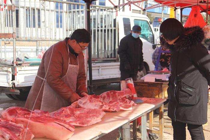 猪肉是年夜饭上不可缺少的菜肴。虽然天气寒冷,肉摊旁边依然聚集了购买年货的人们